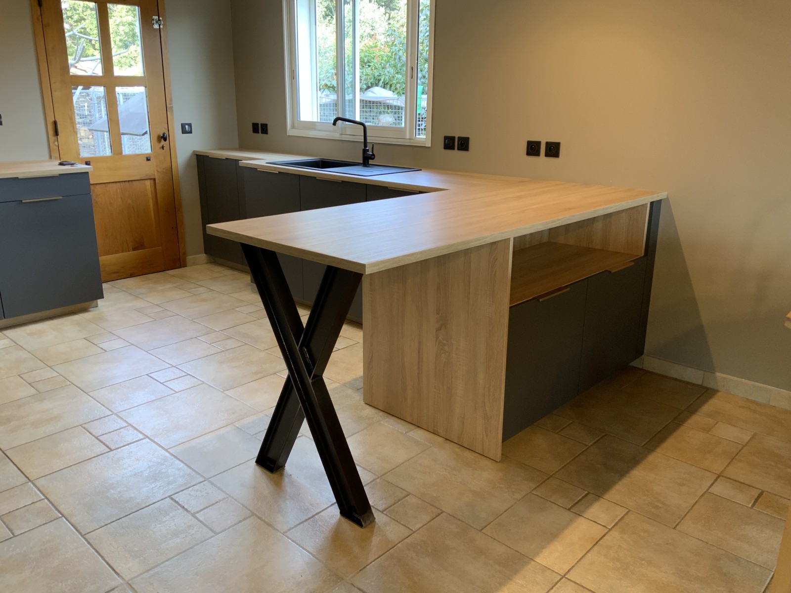 Le choix des matériaux est essentiel dans la réalisation de cette cuisine sur-mesure. Le plan de travail résistant aux rayures, les façades modernes et les finitions soignées créent une ambiance contemporaine et chaleureuse. Cette cuisine est à la fois robuste et esthétique, répondant parfaitement aux attentes de nos clients en termes de design et de fonctionnalité.